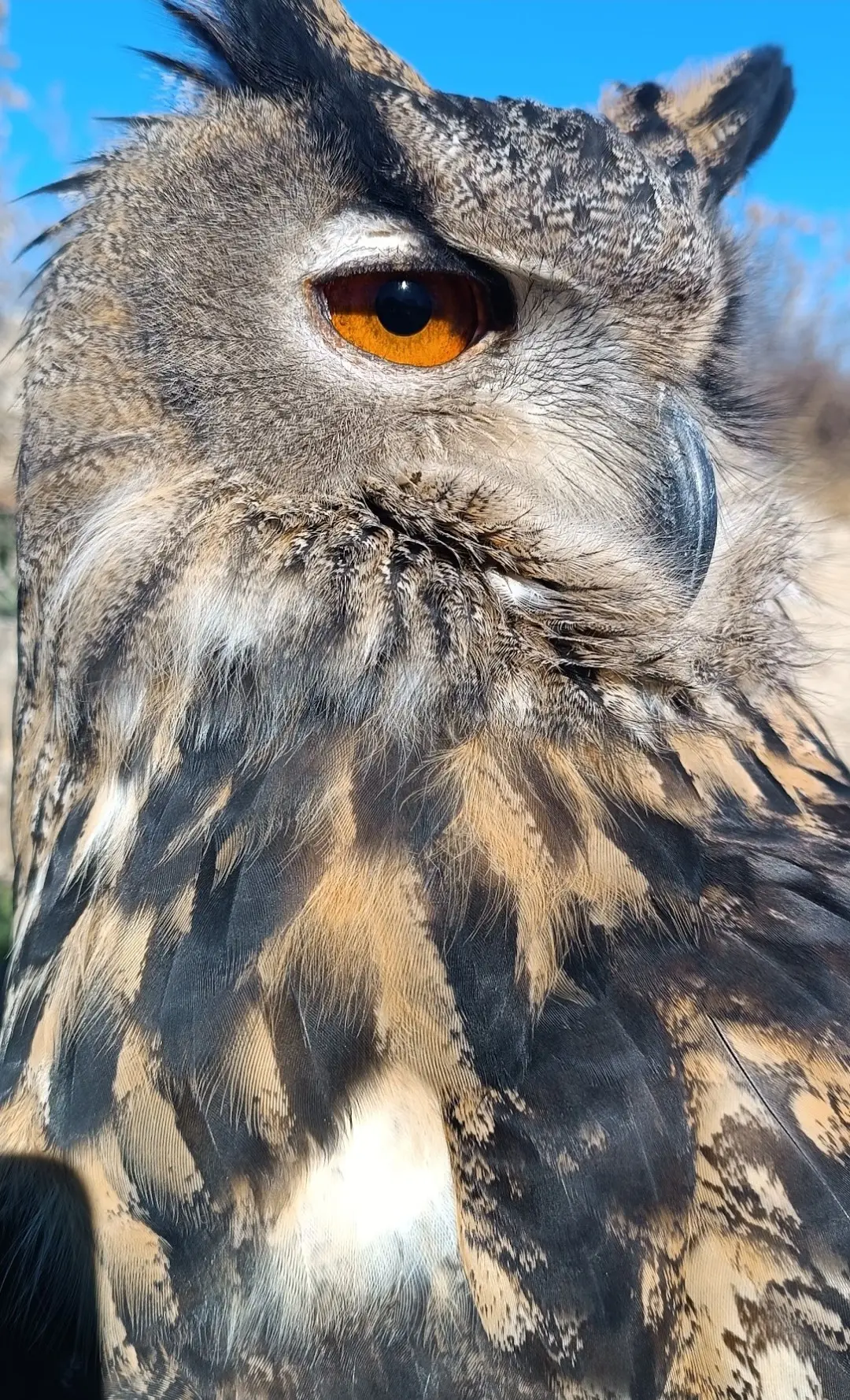 En la cetrería, el búho real transmite respeto y admiración por su porte y su inteligencia. Ginebra, con su presencia imponente, representa la elegancia y la fuerza de esta especie única. Es un verdadero embajador de la conexión entre el hombre y la naturaleza.